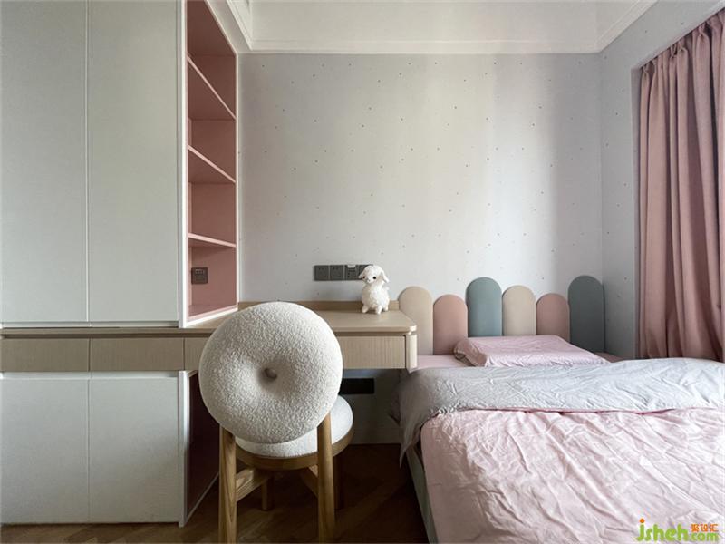 ?女孩房與老人房之間墻體借位做成衣柜儲(chǔ)物空間,滿足兩間房各自的書桌位需求