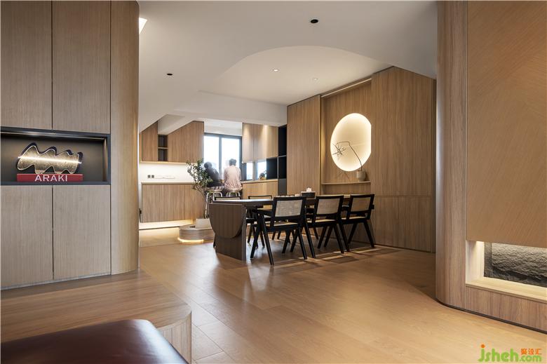 設(shè)計師在純凈的木色空間中,降低了裝飾性的干擾,“一輪明月”位于空間中央,方中帶圓,光影之中點綴一株植物,布局的素雅與木質(zhì)的溫潤給人一種寧靜溫馨。