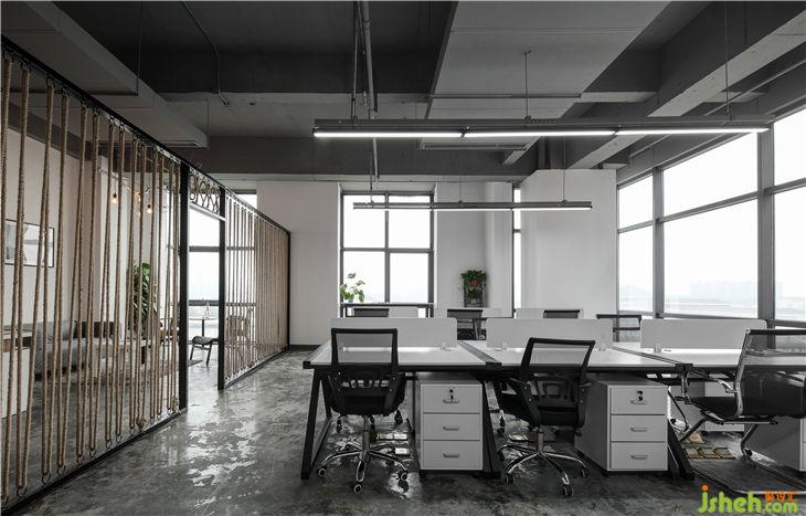 頂部保留原有結(jié)構(gòu),灰色漆和水泥地面搭配白色辦公桌面,黑色辦公桌支架和黑色辦公桌椅與黑色的隔斷框架色彩呼應(yīng)。整個空間采用黑白灰三色為主色調(diào),簡單統(tǒng)一。