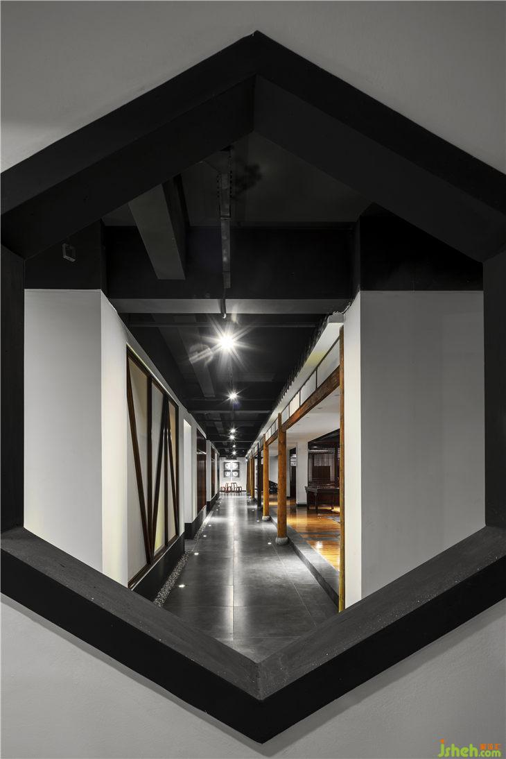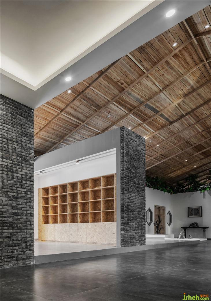 東西兩邊入口,白色乳膠漆墻面與江南常見的灰磚兩相呼應(yīng),頂部預(yù)留足夠的空間設(shè)立屋頂花園。讓屋頂內(nèi)再有屋頂,不同空間之間有效得到緩沖,同時(shí)解決高度不一,材質(zhì)不一造成的節(jié)點(diǎn)收口問題。模塊化的玻璃隔斷有規(guī)律的一字縱向展開,用來分隔兩種不同功能分區(qū)。立面上一分為二,解決6米多層高帶來的困惑,材料上采用原木木方呼應(yīng)公共區(qū)域的吊頂材質(zhì)。