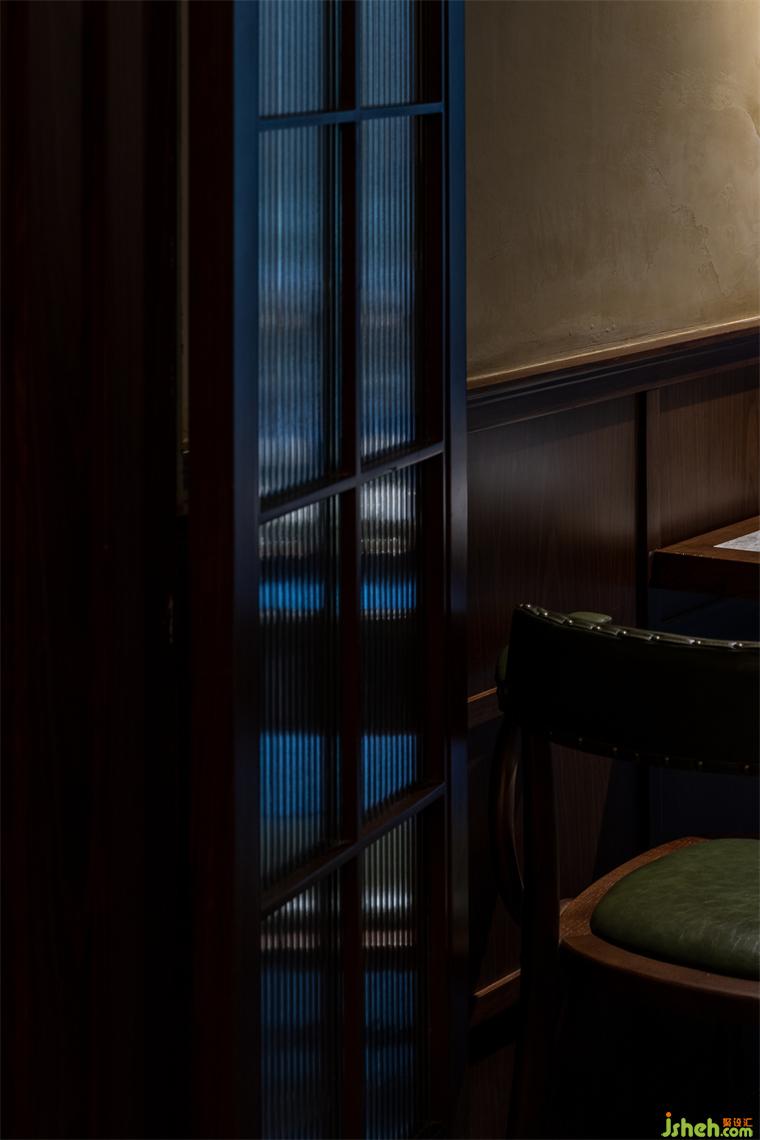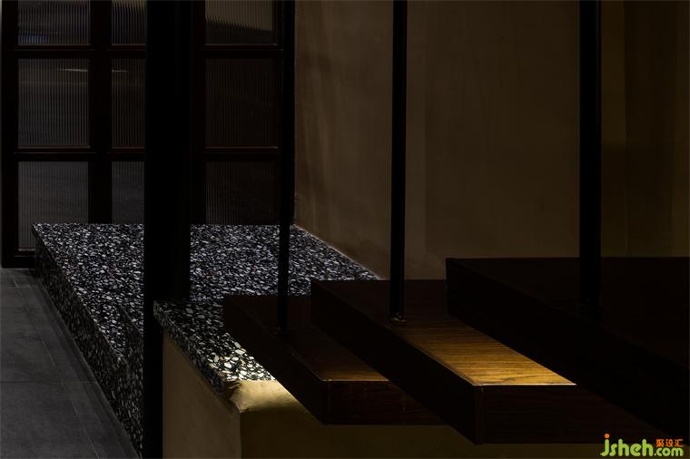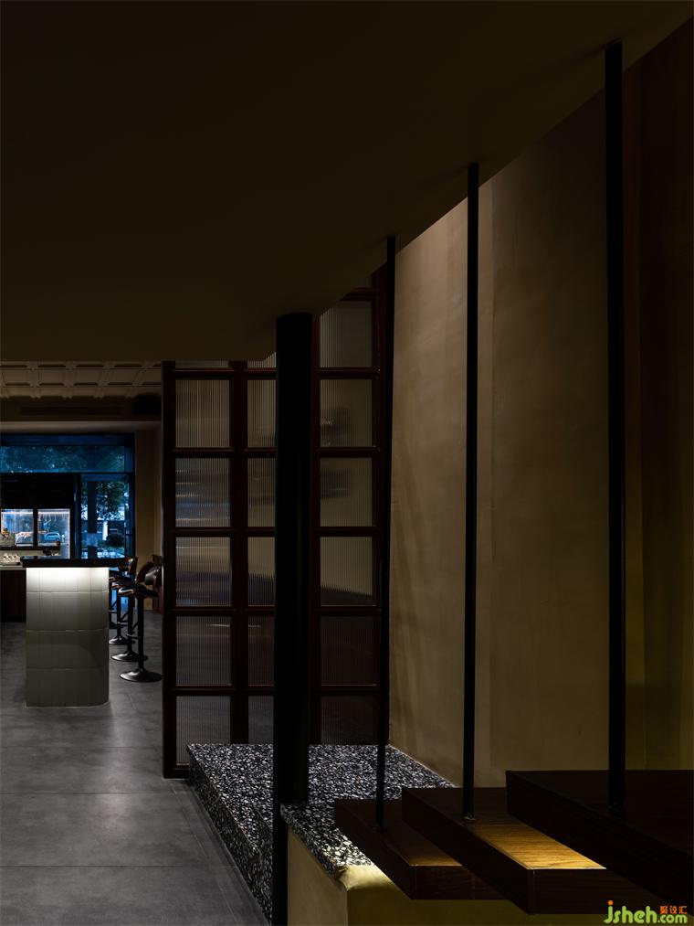通過增設夾層的方法,大面積的轉折平臺既延緩了上樓梯的尺度問題,又擴大了實用空間及景觀氛圍。懸空的樓梯踏步彌補了尺度上的不足,同時在結構上也讓空間節(jié)奏變得更有秩序。夾層與一樓產(chǎn)生的高差,餐廳設計制造了可觀可望的空間趣味和朦朧的意境。