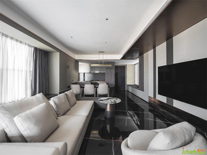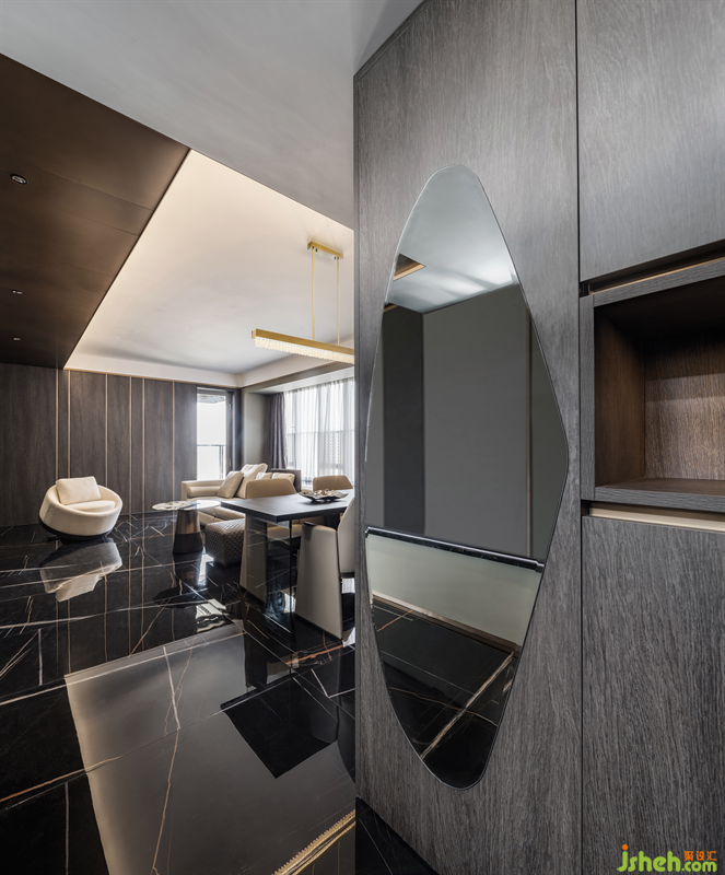 深色的高亮光大理石瓷磚猶如一片寧靜的湖面,倒影著空間的每一處風(fēng)景,室內(nèi)設(shè)計(jì)師讓僅有2.4米的層高隨著視線的上下移動,給空間帶來更高尺度感。以空間的反映,簡單之中蘊(yùn)含精致,呈現(xiàn)一場視覺盛宴。