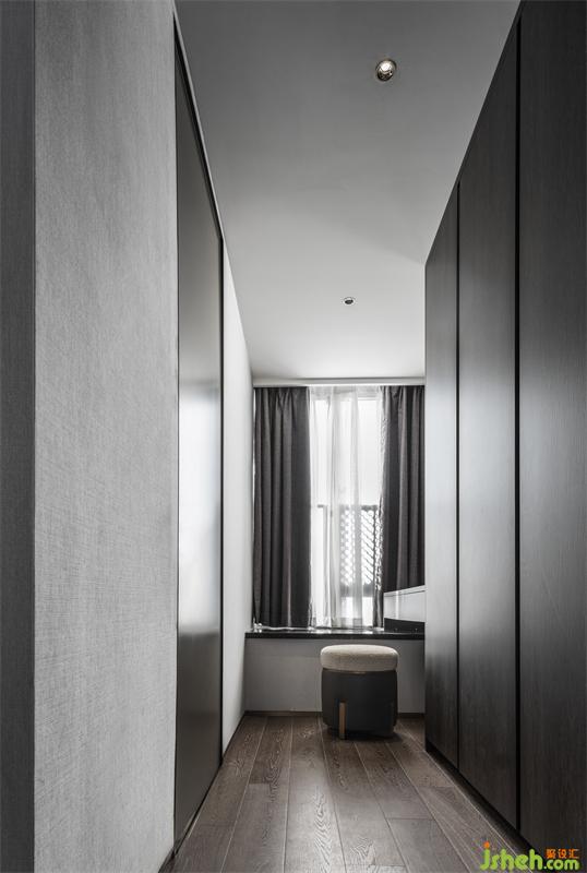 與主衛(wèi)的連接處,設(shè)計(jì)師細(xì)心的為業(yè)主預(yù)留了獨(dú)立的更衣室,衣柜里隱藏了衣物烘干消毒柜,專門收納貼身衣物。墻面搭配了冷灰的飾面,營造出極致的高級感。