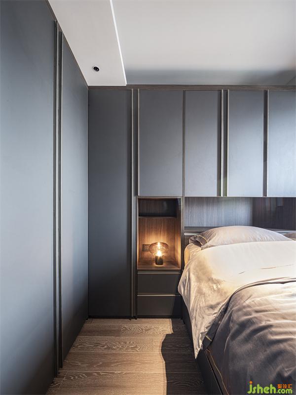 次臥更多用來(lái)作為收納空間以及親朋偶爾留宿用的客房,設(shè)計(jì)師巧妙運(yùn)用窗邊的位置,為房主人放置了一張1.8米的大床。室內(nèi)設(shè)計(jì)師靠墻面帶訂制裝飾柜的設(shè)計(jì)搭配上暖色的現(xiàn)代簡(jiǎn)約燈飾,明亮舒適,儀式感十足。
