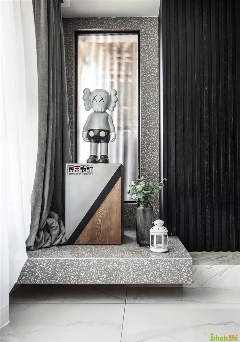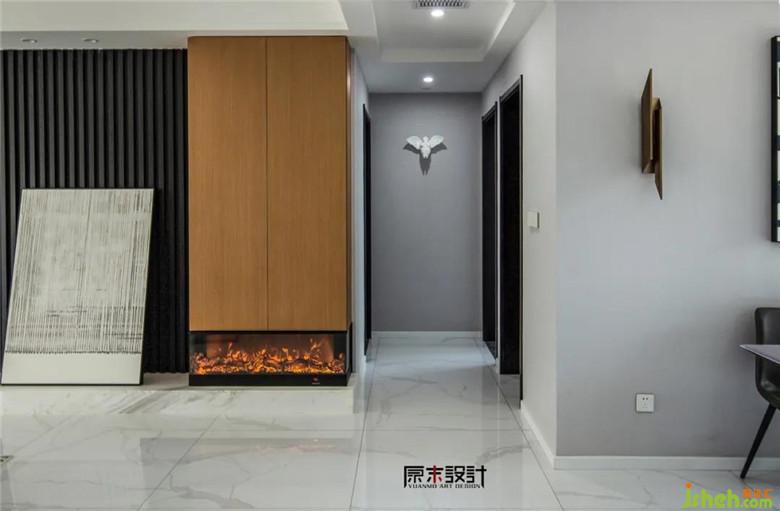 ▲ 現(xiàn)代簡約能書寫藝術(shù)、感知浪漫、領(lǐng)悟人生,觸碰最純粹的紋理,感知深藏的暖意。淺灰色墻布、白色地磚、嵌入壁爐的木色KD板儲物柜,搭配精選軟配,讓入戶的視覺獨特且充滿韻味。