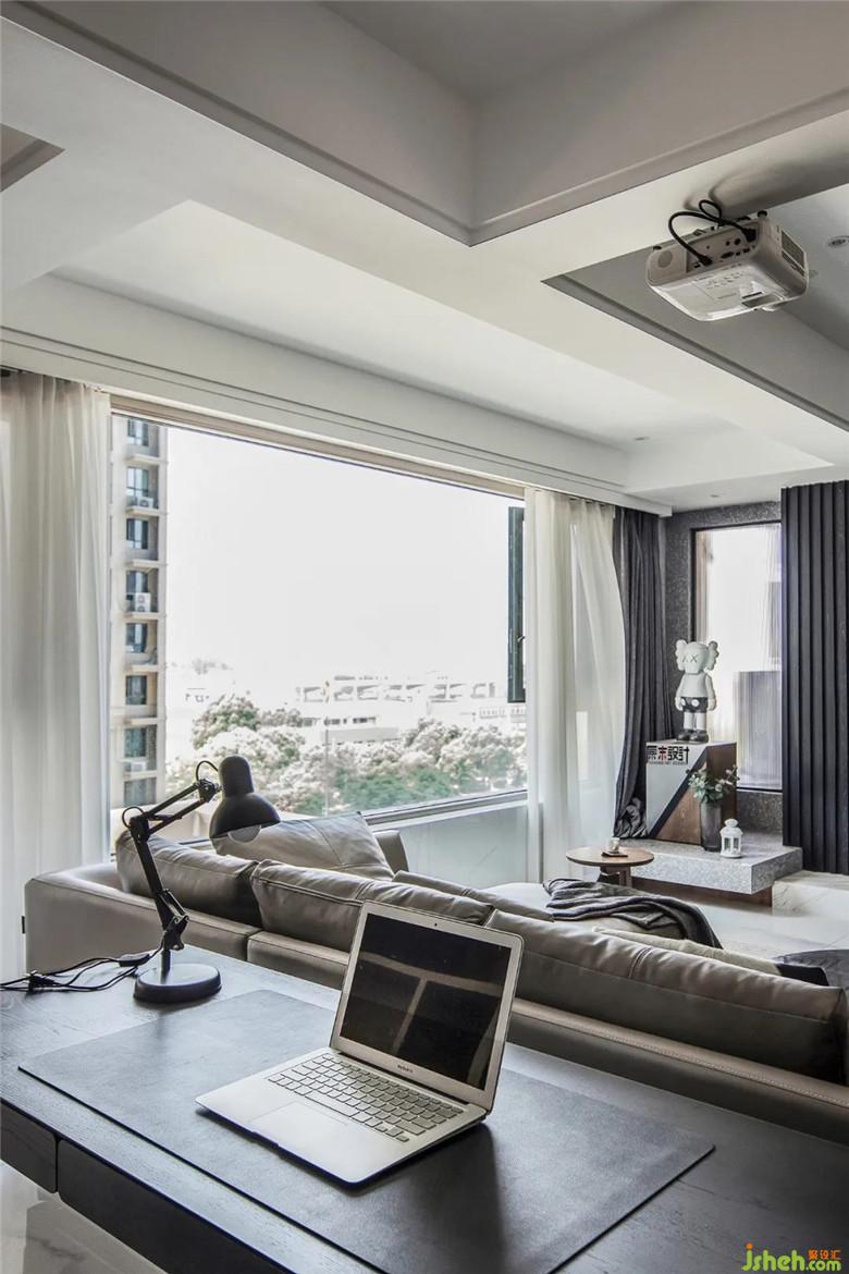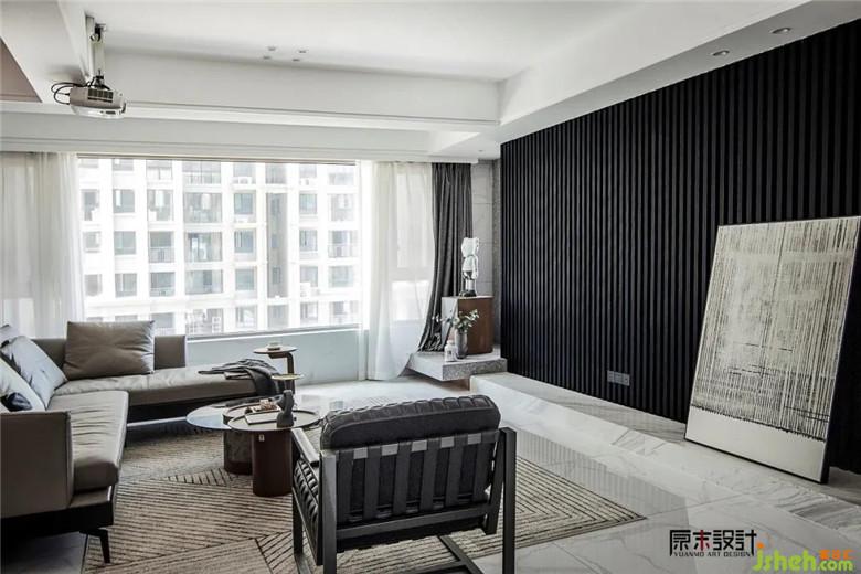 ▲ 利落的線條,起伏的光線,裝修公司把理性思維和浪漫情懷充分地融合在了一起。黑色的KD板沉淀出高級感,搭配120寸的家庭影院系統(tǒng),整個客廳有趣、有品,而且一點也不高傲,設(shè)計師將客廳的個性和狀態(tài)拿捏得剛剛好。