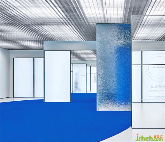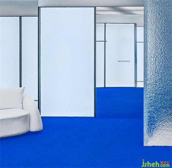 而在冰凍的深處是一片藍(lán)色,F(xiàn)ITTING ROOM呈現(xiàn)的是一塊ICE CUBE ,水紋玻璃的盒子包裹著一個藍(lán)色的體塊,感受到能量、傳遞、純粹,一種靜謐的、無雜質(zhì)、的游走狀態(tài)。