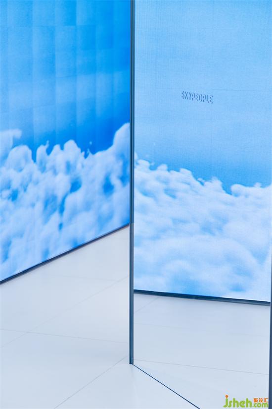 在空間的核心區(qū)域,我們?cè)O(shè)置了一組LED與鏡面錯(cuò)位擺放的通道,空間被折射、反射,觀看視角會(huì)發(fā)生改變,或是在云端,或是在倒置,這是一種用簡(jiǎn)潔而有力地用空間體驗(yàn)區(qū)去表達(dá)“天空人”的方式。