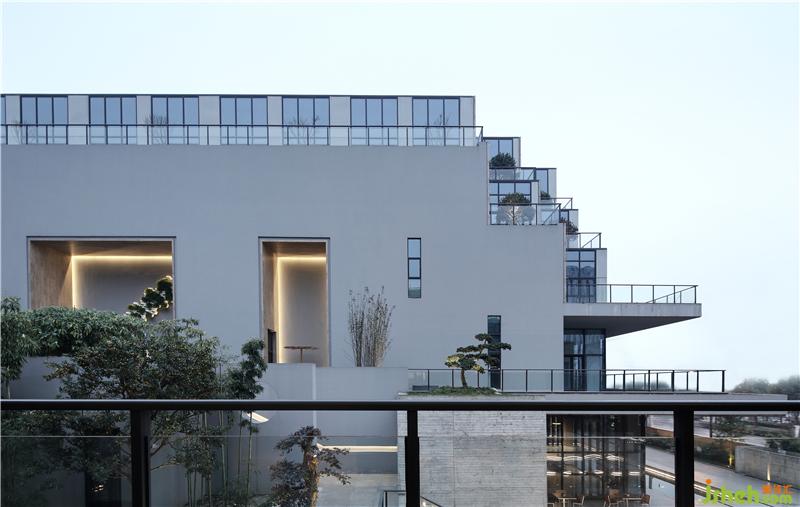 如何在原稍顯陳舊的工業(yè)園區(qū)中打造一個(gè)富有有時(shí)代性與國(guó)際視野的企業(yè)形象是我們執(zhí)筆前考慮的重中之重。通過(guò)對(duì)企業(yè)的內(nèi)部功能需求,不同區(qū)域?qū)θ照招枨蟮姆治黾翱茖W(xué)合理的交通動(dòng)線規(guī)劃,圍繞著水院,在功能上由南向北劃分了辦公樓、企業(yè)接待會(huì)所、企業(yè)管理中心、倉(cāng)儲(chǔ)中心。通過(guò)建筑BOX的巧妙穿插、抬高、挖空、切割,用雕塑的手法構(gòu)造出“堆山式”的建筑,使整體的建筑空間既有良好的采光又有和而不同的形態(tài)韻律之美。庭院水系的取巧劃分,給來(lái)賓一番有別于常規(guī)工廠慣性認(rèn)知,恍如邁入一個(gè)生態(tài)自然的文創(chuàng)院落。由東向西的建筑抬地處理讓視野通達(dá),富有層次之美。