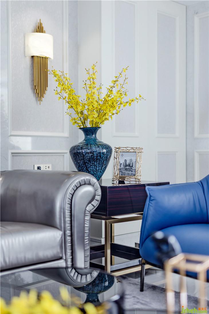 純白色的主基調(diào)上,用灰色的壁紙和藍(lán)色的配飾進(jìn)行調(diào)和與碰撞。時(shí)尚現(xiàn)代的灰色皮質(zhì)沙發(fā)和金屬燈飾的搭配,放在整個(gè)空間中,卻又讓人覺得很和諧。