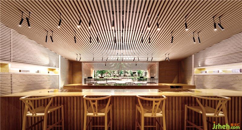 竹葉青的產(chǎn)品種類是精選過的,并不繁雜,因此我們縮小了商品展示空間的比例,而著重在人與人之間的互動。悠閑的生活步調(diào)是大家對成都人的印象之一,另一個印象就是在庭院中喝著用蓋碗杯泡的竹葉青茶。過去十多年,竹葉青在品牌的塑造上并沒有強(qiáng)調(diào)”怎么喝竹葉青茶”這件事,我們現(xiàn)在把它強(qiáng)調(diào)出來,創(chuàng)造喝茶的氛圍。同時我們也把竹子帶入店內(nèi)空間,竹子也是大眾對四川的一個普遍印象;店鋪設(shè)計我們也在竹子格柵的設(shè)計上著墨,將其發(fā)揮得淋漓盡致。店鋪設(shè)計
