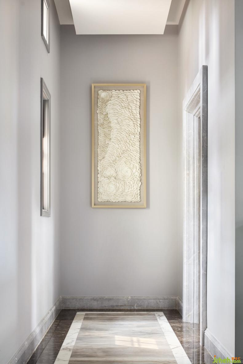 主臥室對(duì)稱式構(gòu)圖與人字形天花設(shè)計(jì),體現(xiàn)出了東方的平衡與穩(wěn)定之美,大面積低飽和度的米灰色墻布,柔和的燈光,儒雅現(xiàn)代的家具形態(tài),烘托出安靜和諧的氛圍。