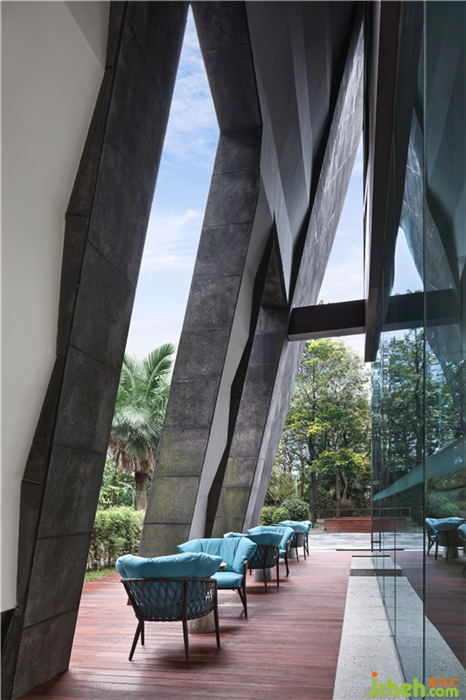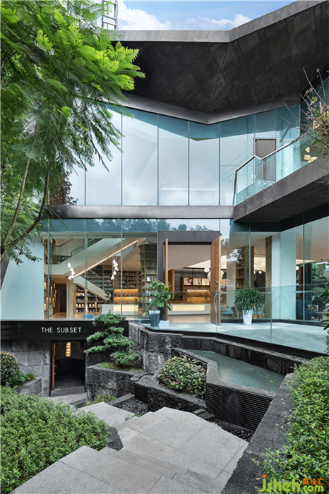 撥開掩映的層層林泉,錯落有致的疊水活潑了畫面,將人們的視線導(dǎo)向建筑入口。庭院的清雅幽然,為整個建筑空間提供了精致的景觀陪襯,室內(nèi)外一體的規(guī)劃,給人一種整體的安寧之感。