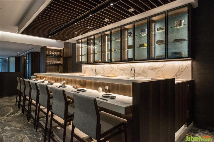 在設(shè)計(jì)選材上,所選用的材料都隱晦地包含著日式元素,如在地磚的選材上,壽司吧臺(tái)區(qū)選用進(jìn)口意大利地磚的靈感,來(lái)源于日本浮世繪的波浪圖案筆觸,搭配墻板和家具再配上煙熏尤加利木,演繹古代日式建筑的和風(fēng)深咖色調(diào)。