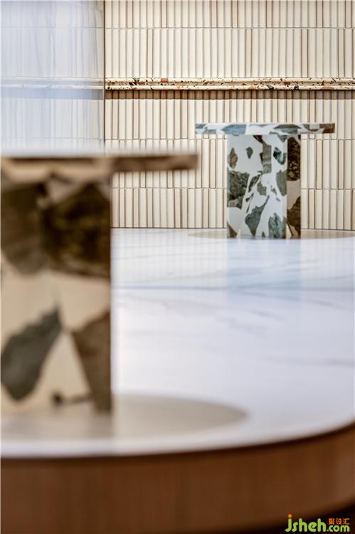 展臺上,一個ASA水磨石設計的矮凳,是OFT對瓷磚不同功能的演繹,瓷磚展廳設計當功能與形式有機結(jié)合,選擇就變成了一次材料探索之旅,矮凳不僅可以作為設計的語言風格去傳承與定義,更是具有品牌價值增量的產(chǎn)品。