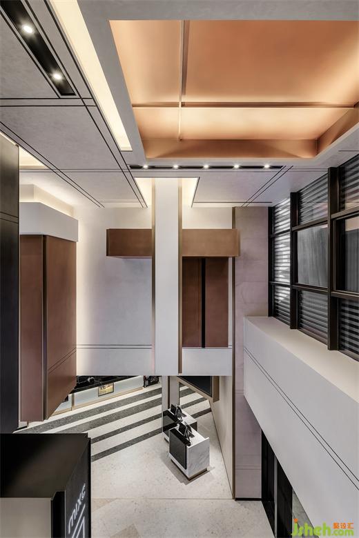 天花在仰視與平視不同的視角的切換下,呈現(xiàn)出截然不同的面貌,影城設(shè)計在復(fù)雜多變的組合下,線條彼此穿疊和連貫,打破了原本枯燥的秩序。正如俄羅斯方塊通過不停制造方塊來抓緊我們的神經(jīng)一樣。