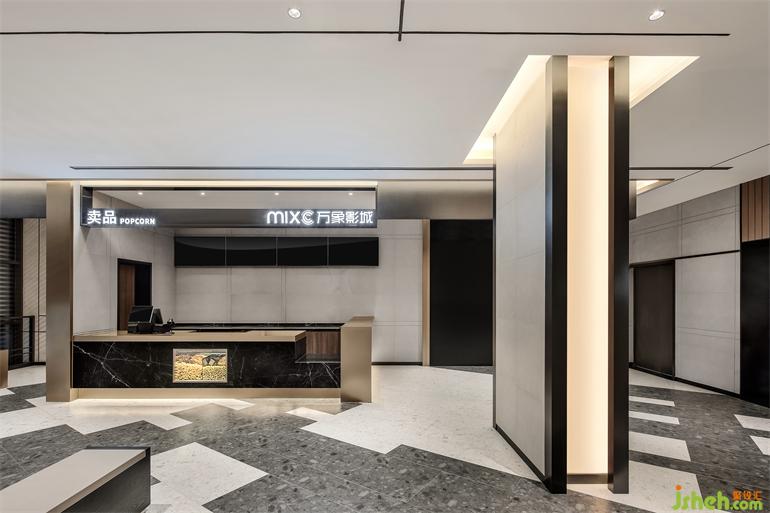 水磨石和砂鋼是整個影院最主要材質(zhì),水磨石的特殊紋理配以啞光質(zhì)感的砂鋼,在淡色和暗色的重疊交互下,讓三維的俄羅斯方塊游戲在二維平面發(fā)生。