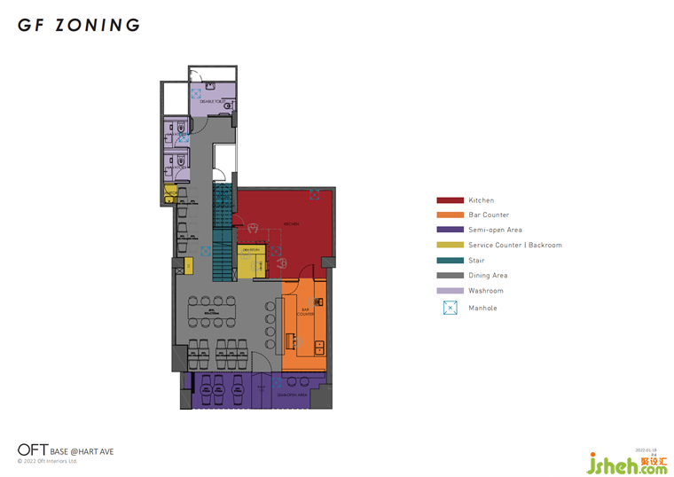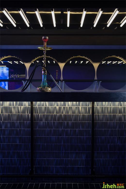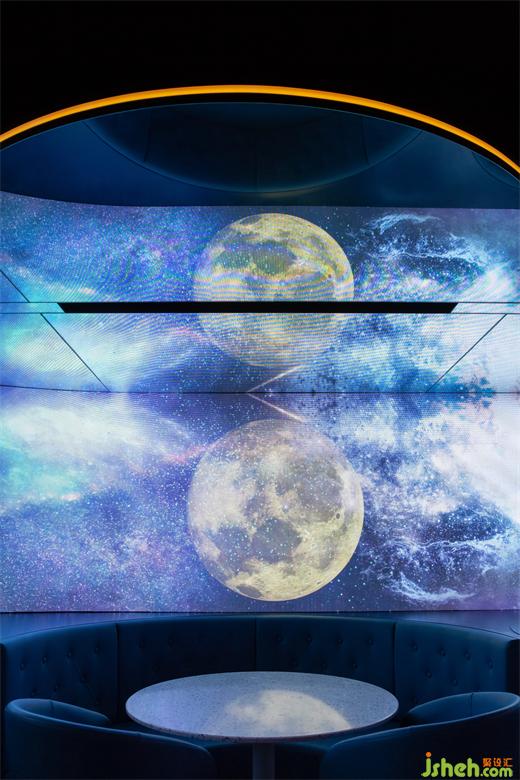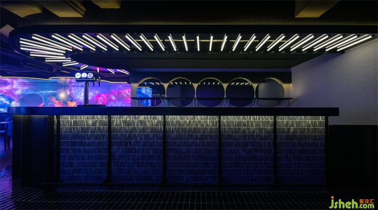 一排規(guī)則排列的燈管與L形吧臺(tái)形成上下對應(yīng)關(guān)系,確保空間的完整、流暢;墻面的圓形鏡面帶來放大空間的效果,也暗示宇宙中其他星球的存在。