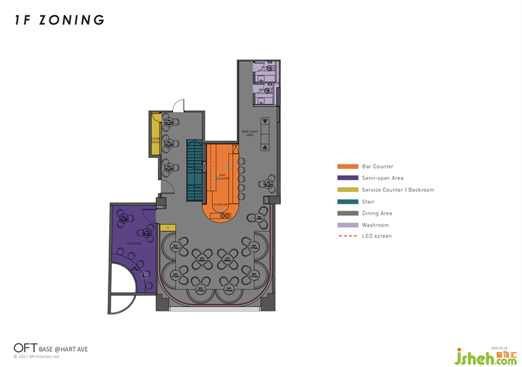 上層的絕對主角還有大面積的LED屏,聚會(huì)區(qū)正是由幾塊LED屏圍合而成,酒吧設(shè)計(jì)作為賽博世界的重要傳播媒介,其靈活多變的特點(diǎn),對酒吧氛圍場景營造起著關(guān)鍵作用。內(nèi)容素材的更換,可以模糊時(shí)間與空間帶來的具體感知,持續(xù)產(chǎn)生新鮮感,為年輕消費(fèi)者帶來沉浸式的新奇體驗(yàn),除此之外,消費(fèi)互動(dòng)又影響著新的場景內(nèi)容的產(chǎn)生。