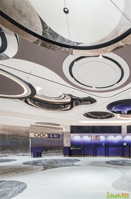 同時(shí),設(shè)計(jì)師還大膽采用紫色作為空間媒介,紫色象征著宇宙的神秘、未知的趣味以及超越現(xiàn)狀的發(fā)現(xiàn),引導(dǎo)觀眾在觀影過(guò)程中沉浸于無(wú)限的想象之中。