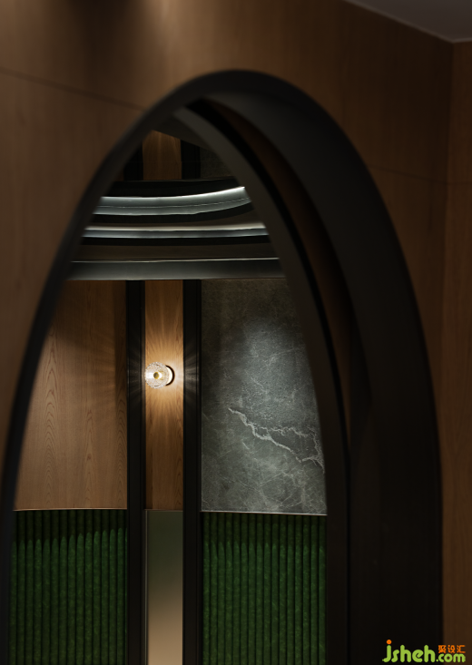 除了功能性,從空間體驗(yàn)來看,疊構(gòu)的拱門造型,延伸的燈光線條,致以購(gòu)房者一種抵達(dá)的儀式感。