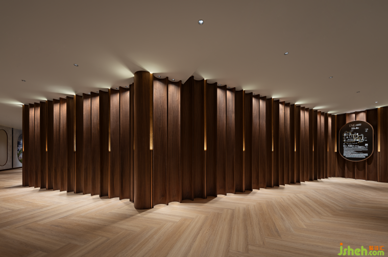 相較于前期路線的探索感,洽談區(qū)更為開闊,環(huán)繞式的設計也令整個空間更具安全感與穩(wěn)定感,促使購房者完成坐下交流的動作。