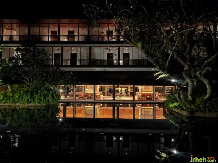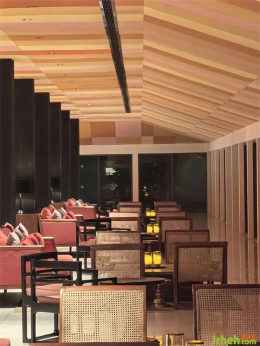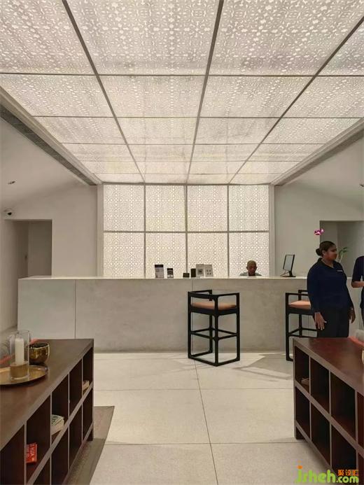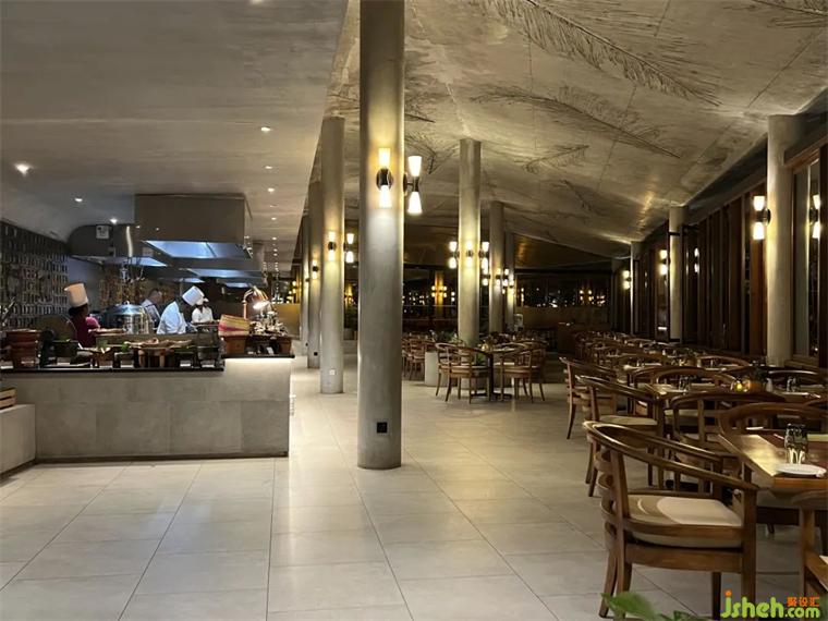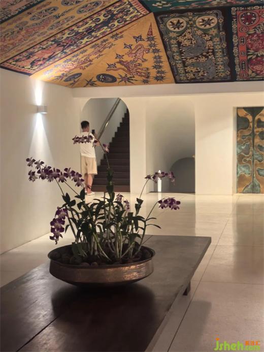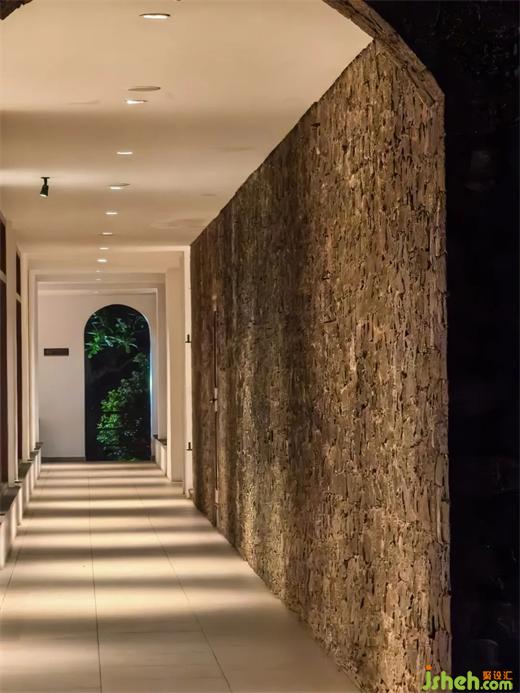 基座層是由毛石砌筑而成的“堡壘”,內(nèi)部空間有種厚實(shí)的洞穴感。二層是以四面圍合的水庭院為中心的公共區(qū)域,這一層的陳設(shè)設(shè)計(jì)得非常適度,繁復(fù)而不油膩。三層往上則是層層向外懸挑的客房區(qū)域,舉重若輕地漂浮。裝修設(shè)計(jì)