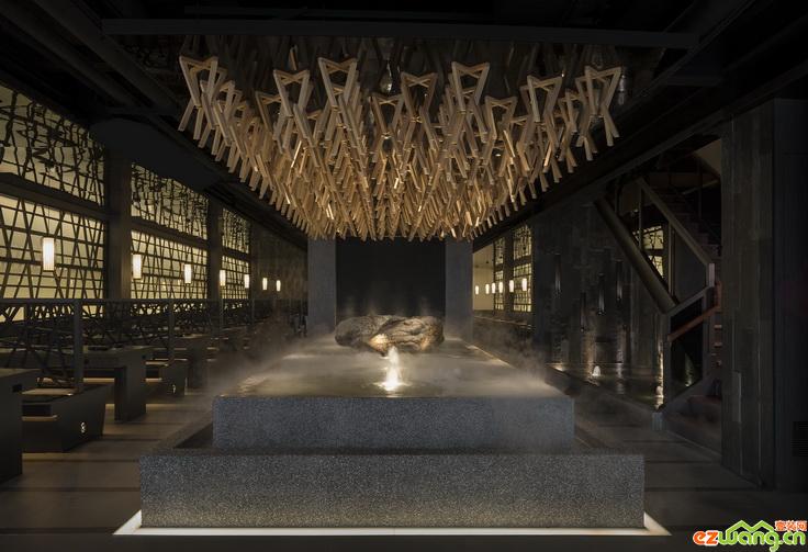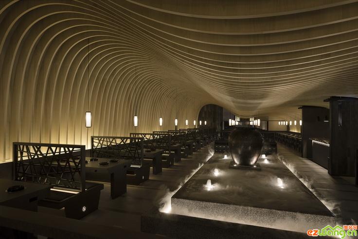 視線前方居中的巨大雙層循環(huán)景池映入眼簾,抿石子砌作的長矩形量體樸實親切,邊緣以光帶將池體與地坪脫開,配合水面造霧器、燈光的運作,強化煙波澔渺間的輕盈漂浮感,池面上方使用大面積黑烤玻璃施作天花板,宛如夜空般深邃的玻璃面,精工鎖上以量取勝的木構(gòu)件群落,造就仰角視野里「數(shù)大便是美」的磅礡張力,并繞著池畔底定全場的循環(huán)動線,而所有用餐的來客,也都能毫無阻礙地欣賞完整造景。此外,環(huán)著煙波水池設(shè)置的卡座造型古樸簡雅,連續(xù)墻面與卡座間的屏風(fēng)介質(zhì),都以交錯的格柵語匯一氣呵成,設(shè)計者特地后襯白膜玻璃,藉光的氤氳,施展?fàn)t火純青的剪影藝術(shù)。