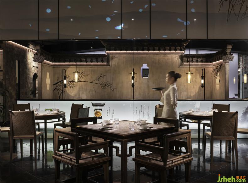 作品簡介:皖廚桃花潭外立面運(yùn)用整面玻璃燈光外墻,國畫寫意結(jié)合現(xiàn)代燈光設(shè)計(jì),繪制抽象徽派建筑線條。餐廳內(nèi)沿用徽派建筑馬頭墻墻體,并于高地懸掛紗幔以聲光電技術(shù)投影桃花瓣飄落場景,室內(nèi)多以中式園林框景手法結(jié)合燈光設(shè)計(jì)繪制陰翳感,金磚地面營造出水的倒影,拉伸空間的維度。