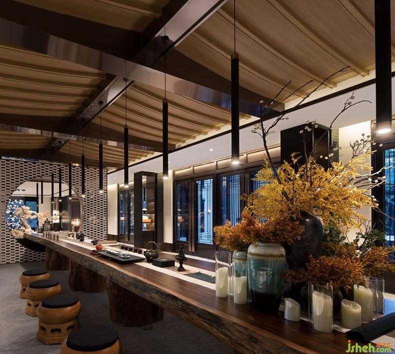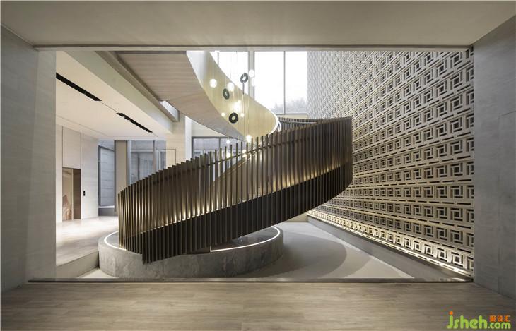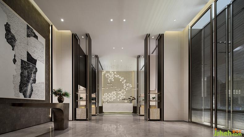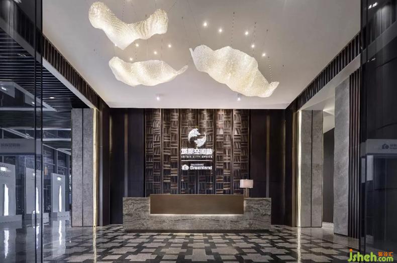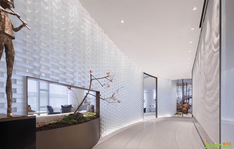 作品簡(jiǎn)介:暖褐色金屬門樓,創(chuàng)造禮儀感與品質(zhì)感的營(yíng)銷游覽動(dòng)線。簡(jiǎn)約大氣的冷灰色石材,流暢的水云紋理融入地面景觀空間,身處曲水流云的度假天境。入接待前廳,月洞形格柵屏風(fēng)運(yùn)用中式園林框景手法把院落景觀映入眼簾。精選紫山水大理石與鍛打山水紋的古銅接待臺(tái)完美契合,尊貴而高雅用現(xiàn)代手法展現(xiàn)禪意韻律。